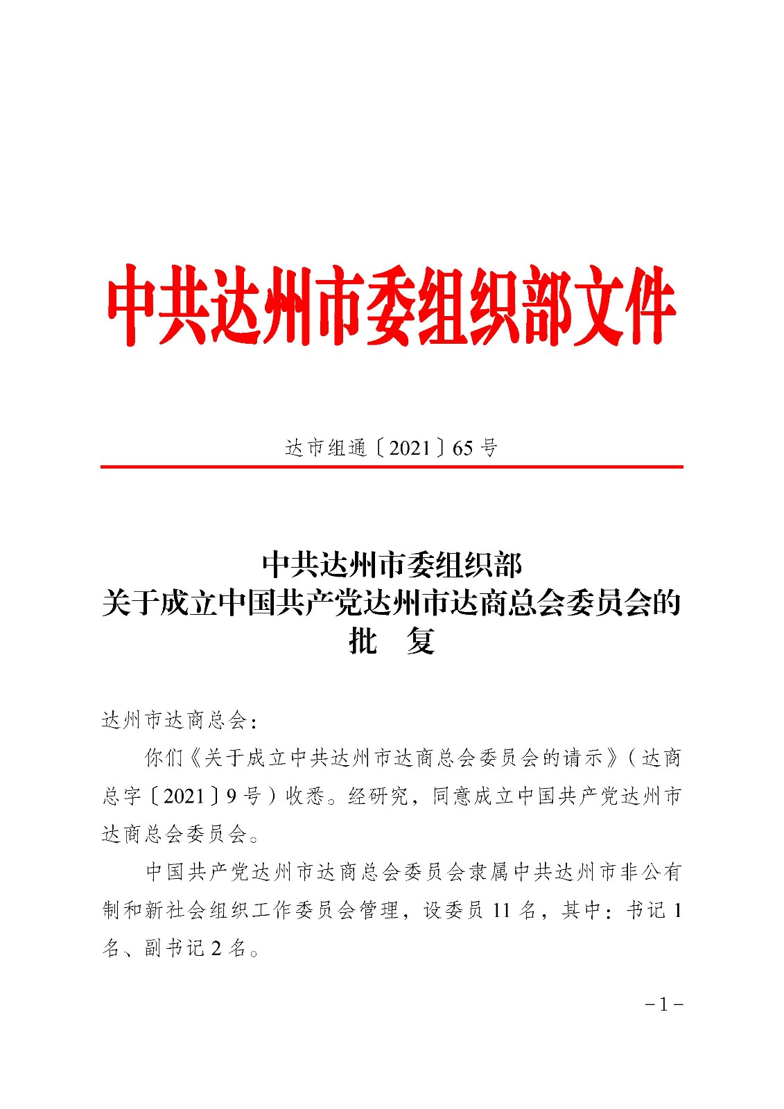达州市委组织部收到《关于成立中共 委员会的请示》后,对提交的资料进行初审。初审同意后,经市委组织部领导同意,给 发出《关于成立中国共产党 委员会的批复》(达市组通〔2021〕65号),同意成立中国共产党 委员会。中国共产党 委员会隶属中共达州市非公有制和新社会组织工作委员会管理,设委员11名,其中:书记1名、副书记2名。
