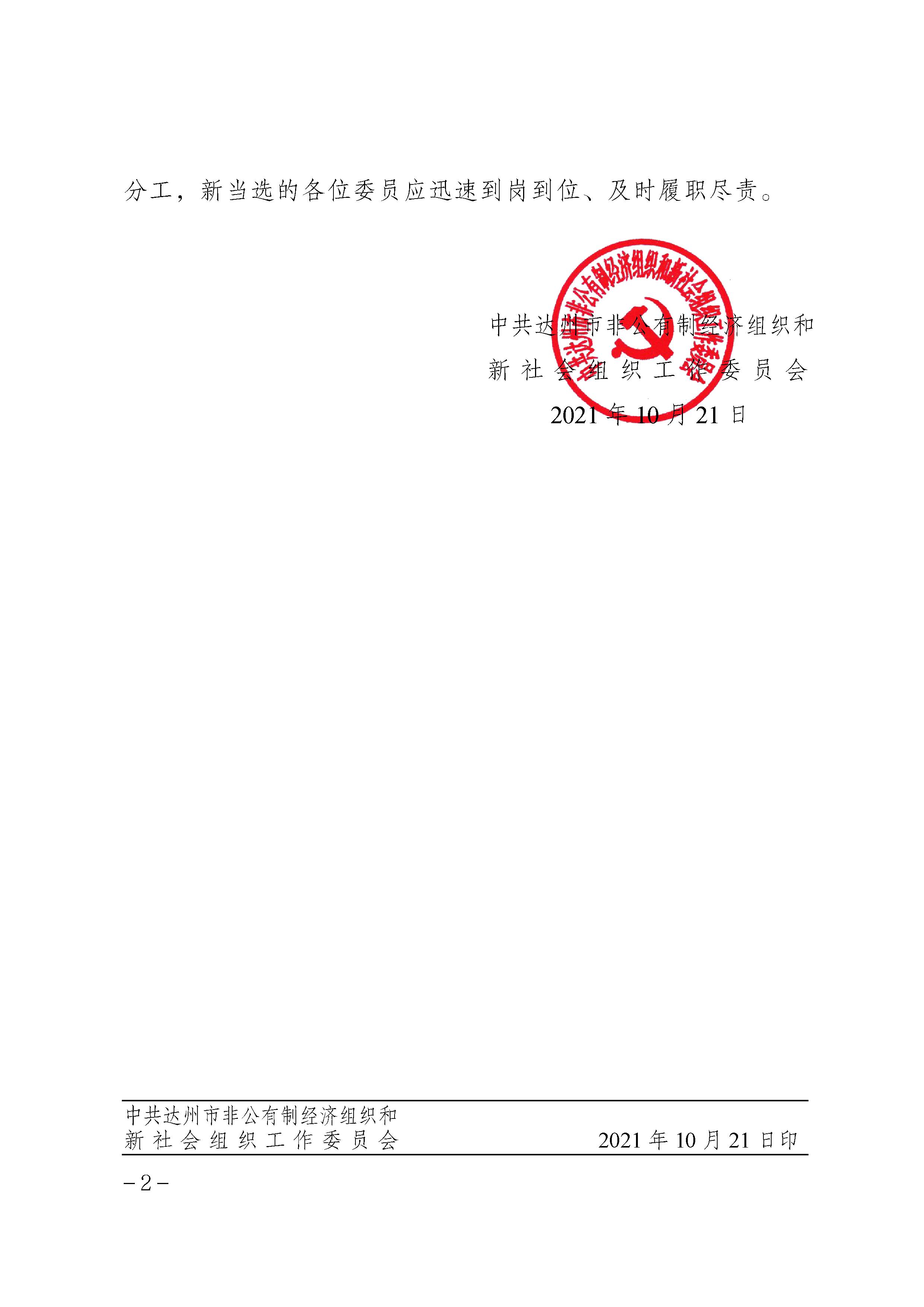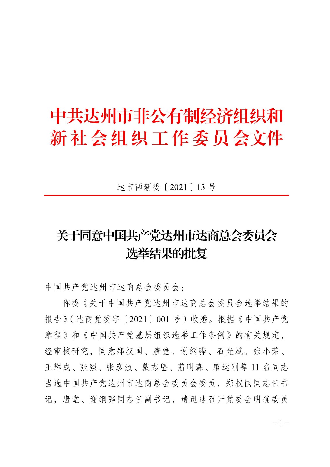 2021年10月21日,中共达州市非公有制组织和新社会组织工作委员会(简称:两新党工委)给中国共产党 委员会发文《关于同意中国共产党 委员会选举结果的批复》(达市两新【2021】13号委),同意郑权国、唐堂、谢纲骅、石光斌、张小荣、王辉成、张强、张彦淑、戴志坚、蒲明森、廖运刚11位同志当选为中国共产党 委员会委员,郑权国同志任书记,唐堂、谢纲骅同志任副书记。中国共产党 委员会领导班子正式建立。