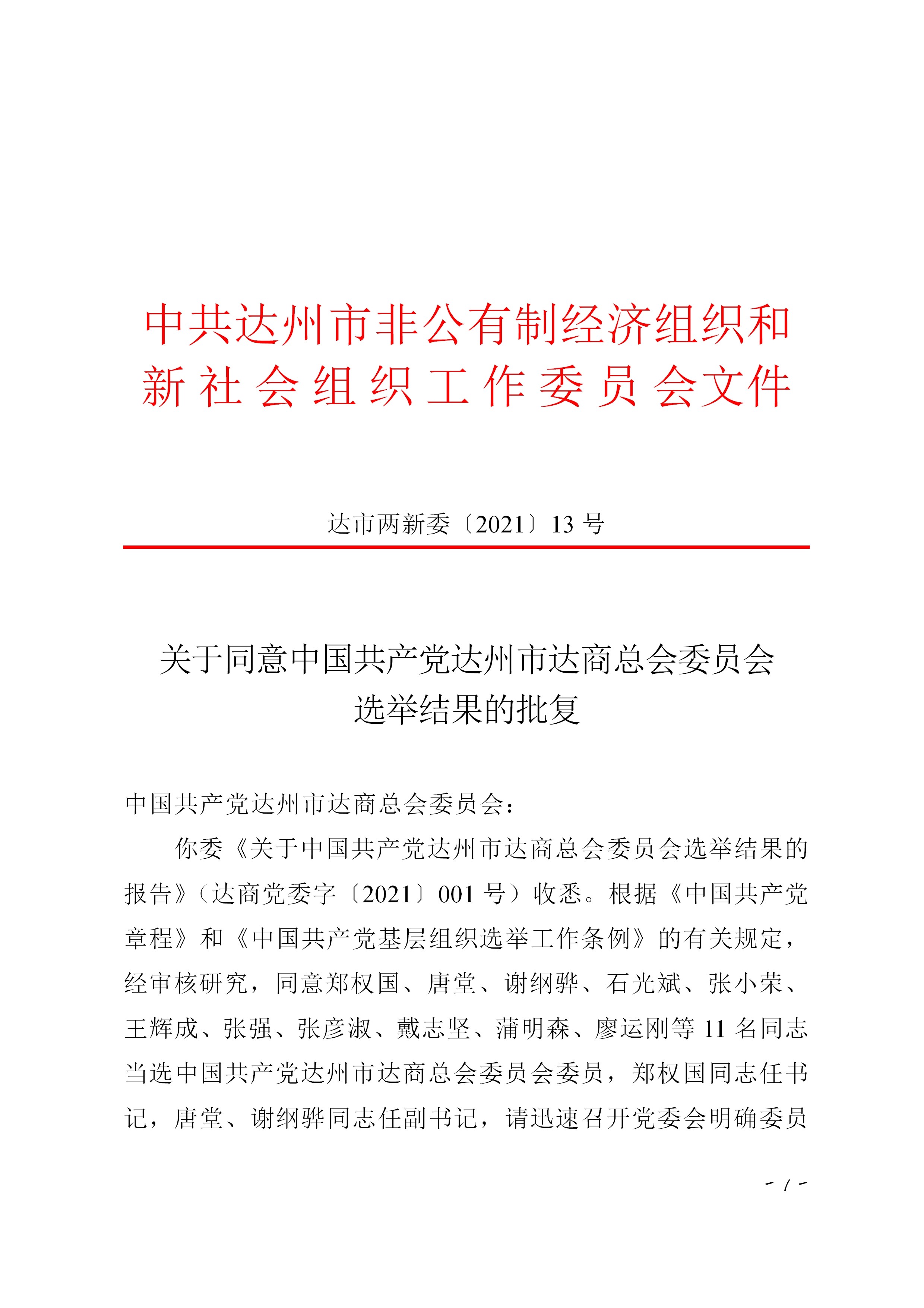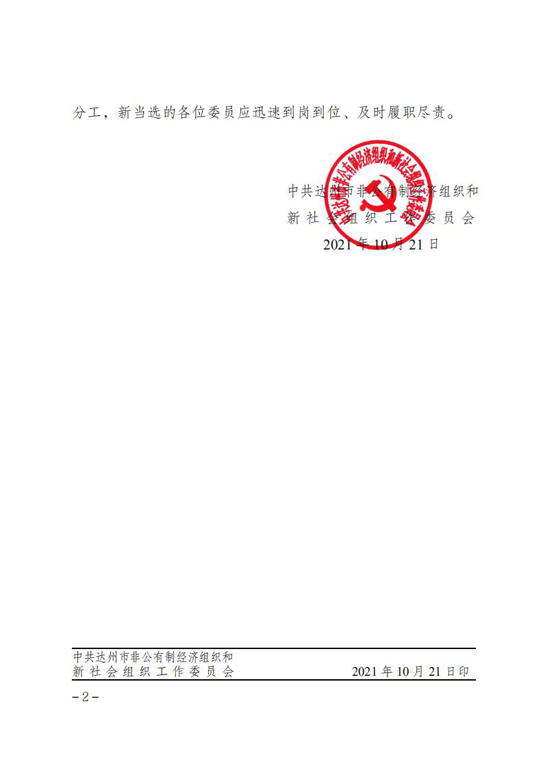 10月21日,中共达州市非公有制组织和新社会组织工作委员会(简称:两新党工委)给中国共产党 委员会发文《关于同意中国共产党 委员会选举结果的批复》(达市两新【2021】13号委),同意郑权国、唐堂、谢纲骅、石光斌、张小荣、王辉成、张强、张彦淑、戴志坚、蒲明森、廖运刚11位同志当选为中国共产党 委员会委员,郑权国同志任书记,唐堂、谢纲骅同志任副书记。