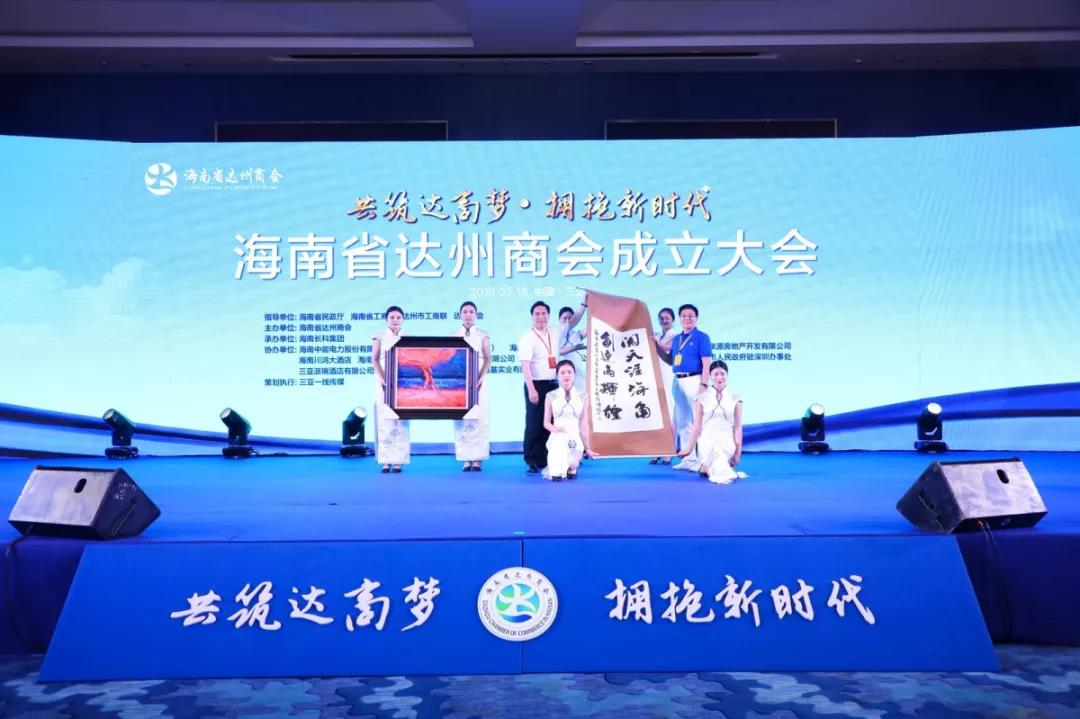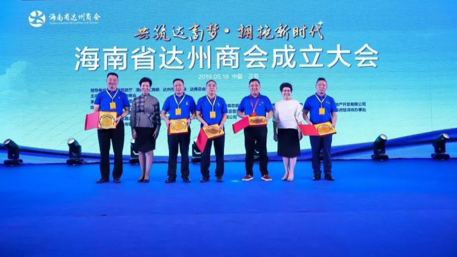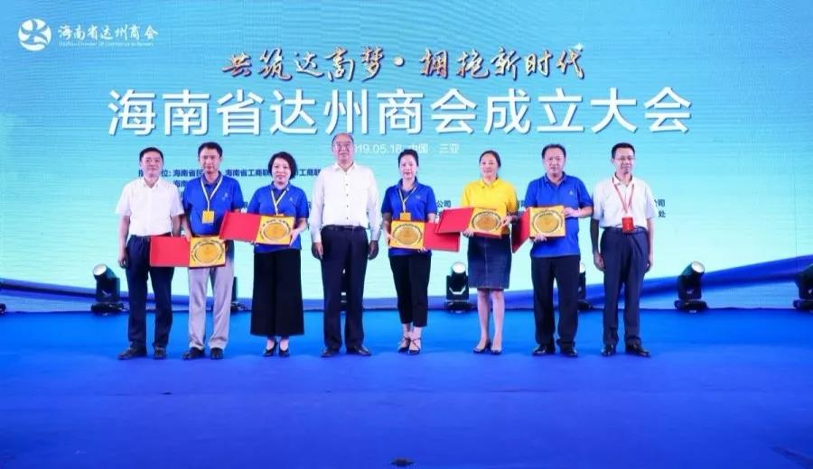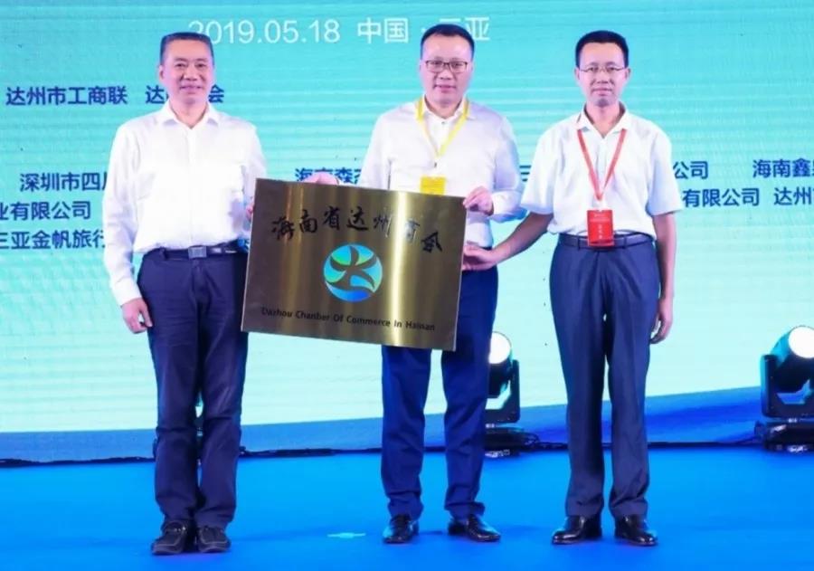 达州市人大常委会主任胥健、海南省工商联商会处处长陈贤敏共同为海南省达州商会会长余长江授《海南省达州商会》牌